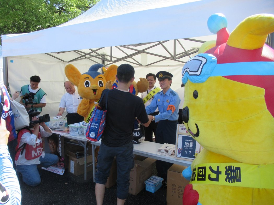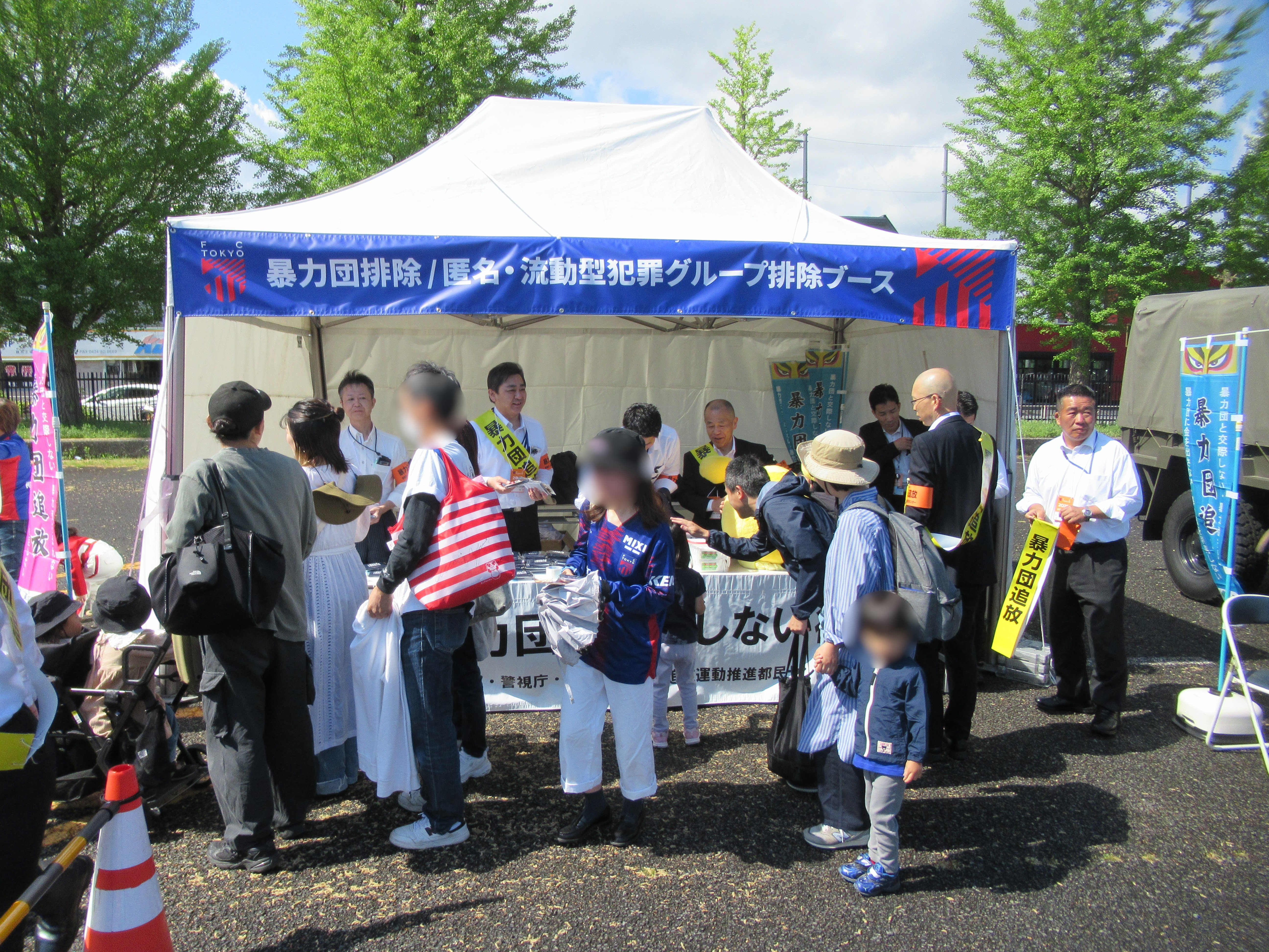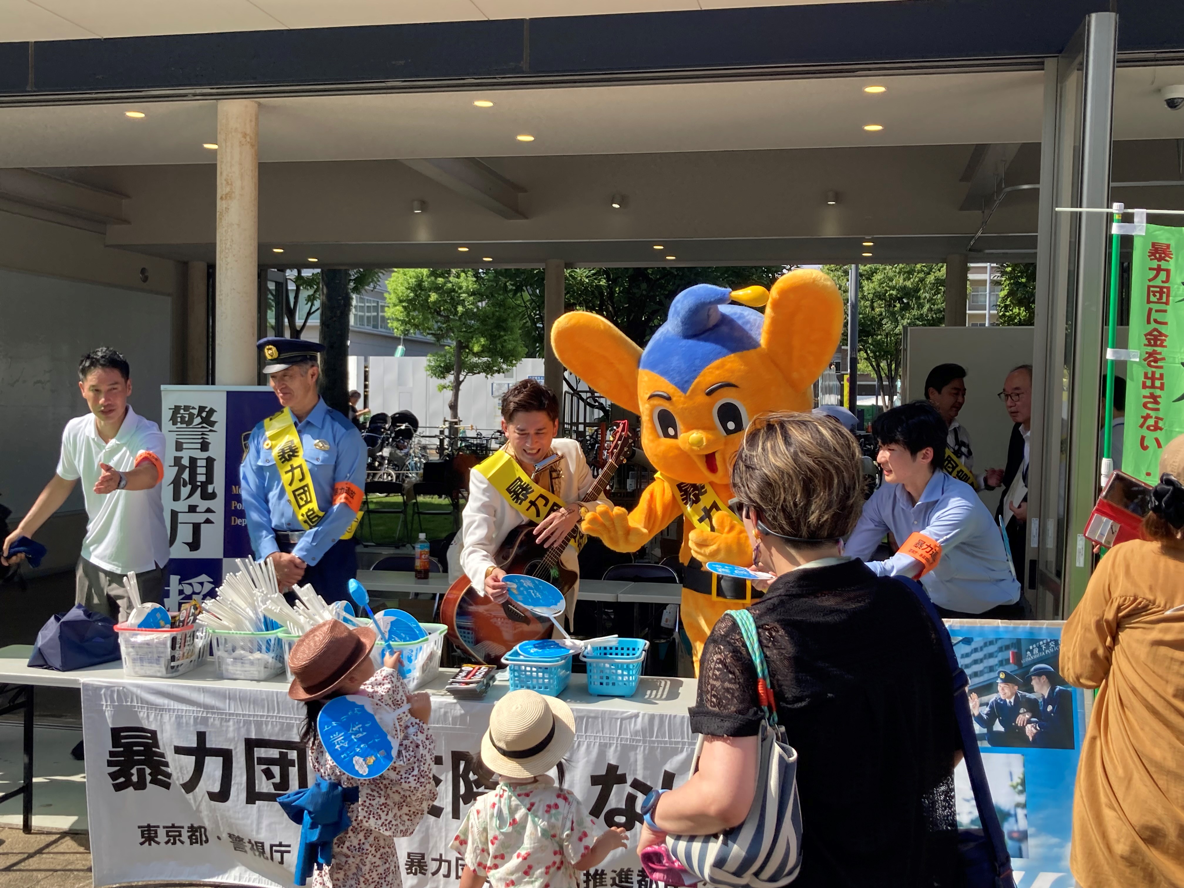 イベントでは、特設ブースにおいて、警視庁のパトカー、白バイの展示や「みまもりぃぬ」と「ピーポくん」、「東京ドロンパ」(FC東京マスコットキャラクター)が暴力団排除の啓発品の配布を行い、「暴力団と交際しない」ことに加え、匿名・流動型犯罪グループによる犯罪に注意するように呼びかけを行いました。
