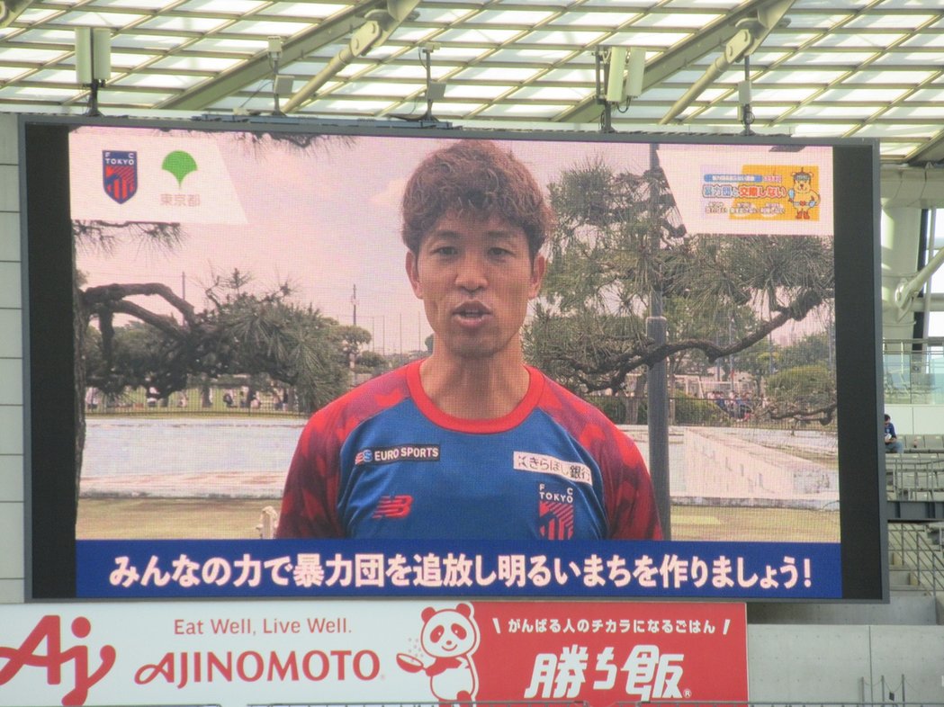 昨年に引き続き、FC東京キャプテン「森重真人」選手による暴力団排除PR動画がスタジアム内で放映されました