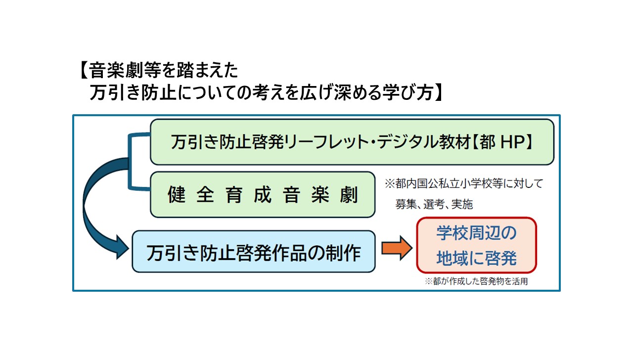 東京都は選ばれた優秀作品を「東京都万引き防止啓発作品」としています。「東京都万引き防止啓発作品」の中から、都は、「万引き防止啓発物」としてステッカー及びポスターを作成しています。音楽劇開催校は、「万引き防止啓発物」を学校周辺の店舗等に依頼し、掲示することをとおして、学校周辺地域における万引き防止の啓発を行っています。