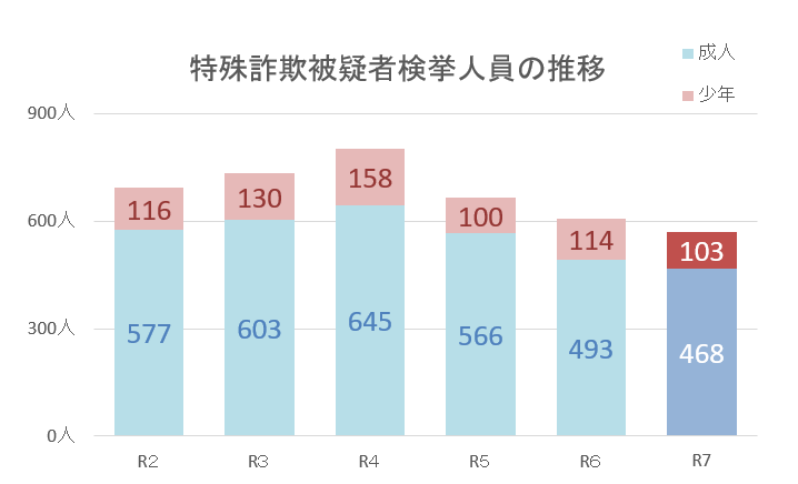 令和7年中に、警視庁が検挙した特殊詐欺の被疑者の総数は571人ですが、その内の103人が20歳未満の少年です。