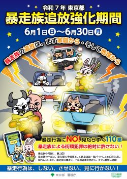 東京都は、警視庁をはじめとした関係機関と連携し、未だ根絶には至っていない暴走族による各種不法事案を未然に防止し、暴走族を許さない環境作りと暴走族追放の機運を高めます。