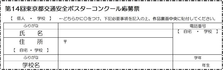 氏名(ふりがな)、住所、電話番号、学校名(ふりがな)、学年を記入した応募票を作品の裏面中央に貼付する