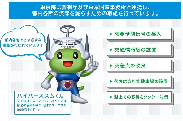 東京都は、警視庁及び東京国道事務所と連携し、都内の慢性的な交通渋滞の緩和に向けた取組を行っています。