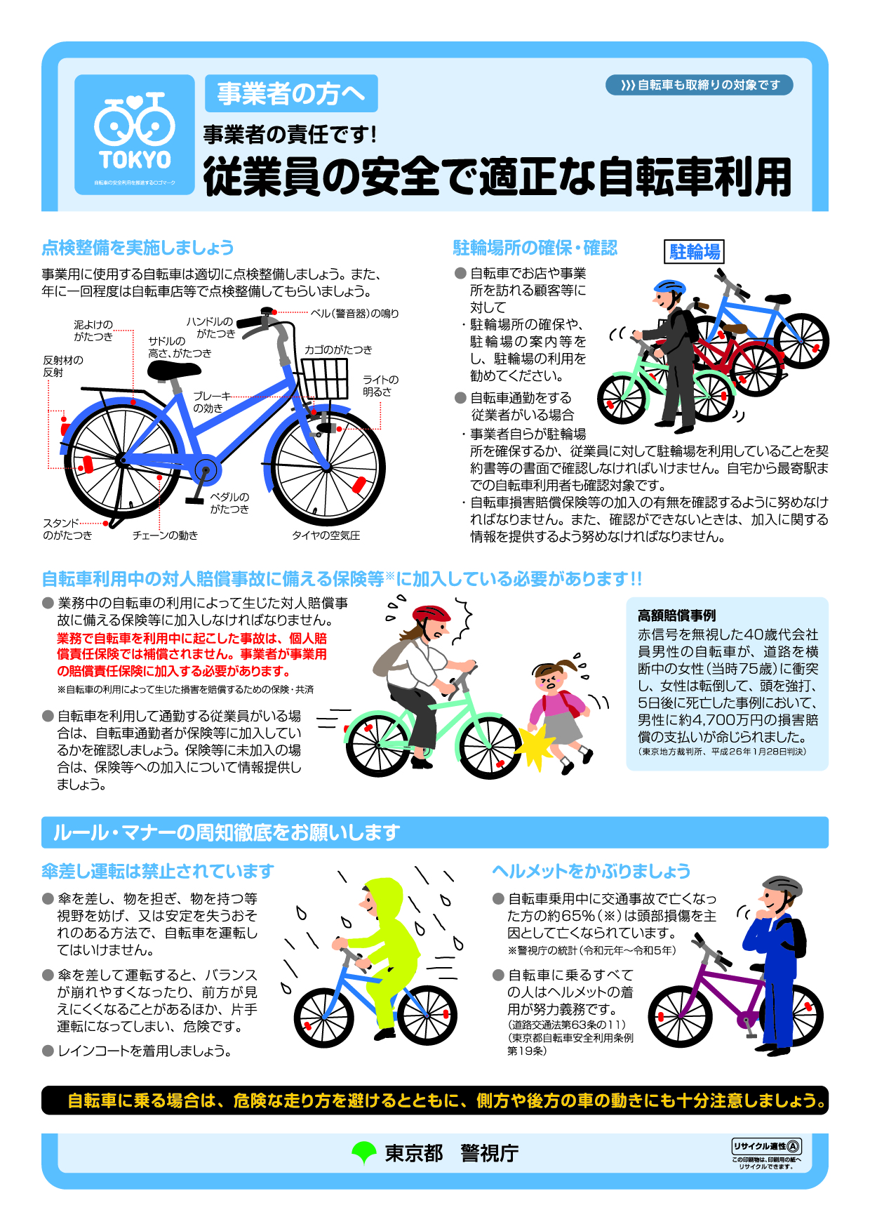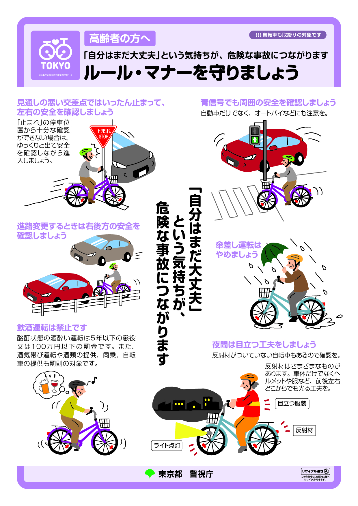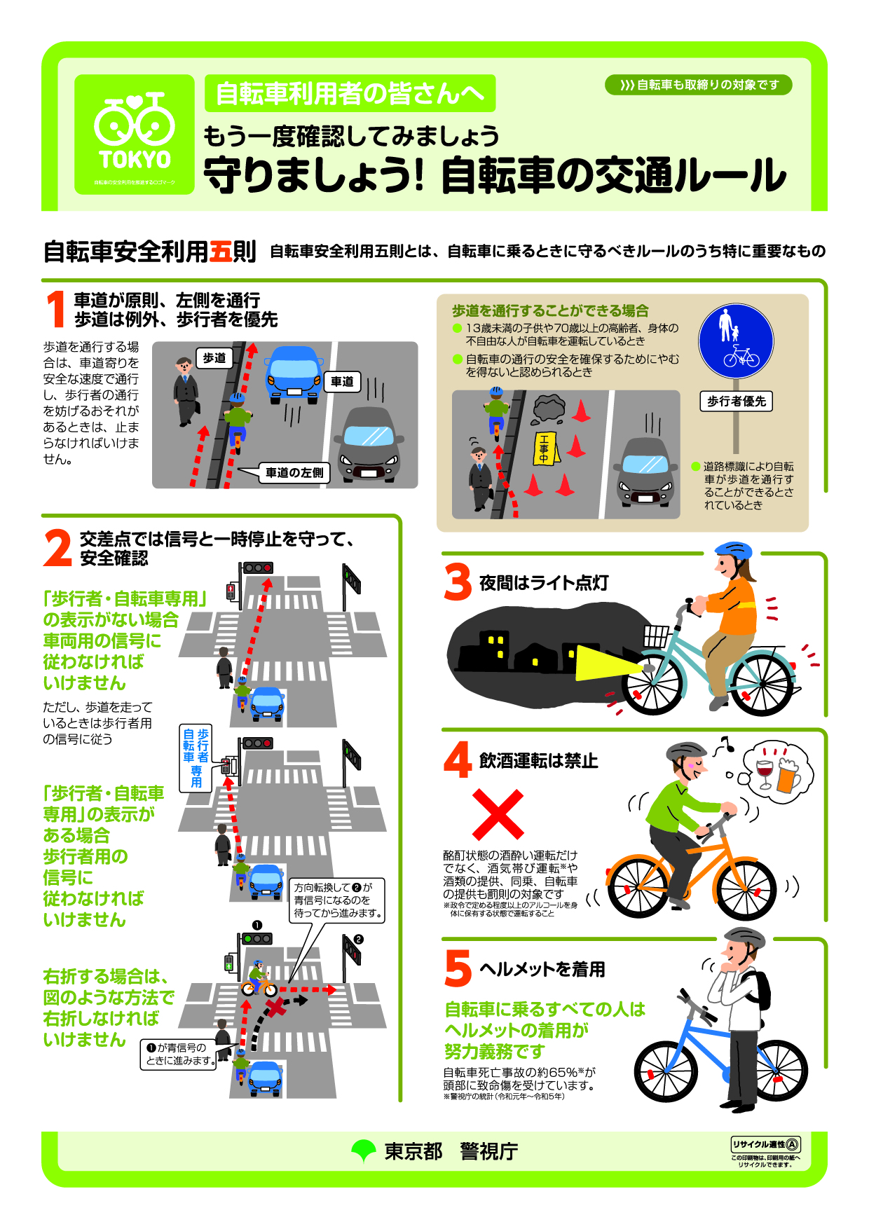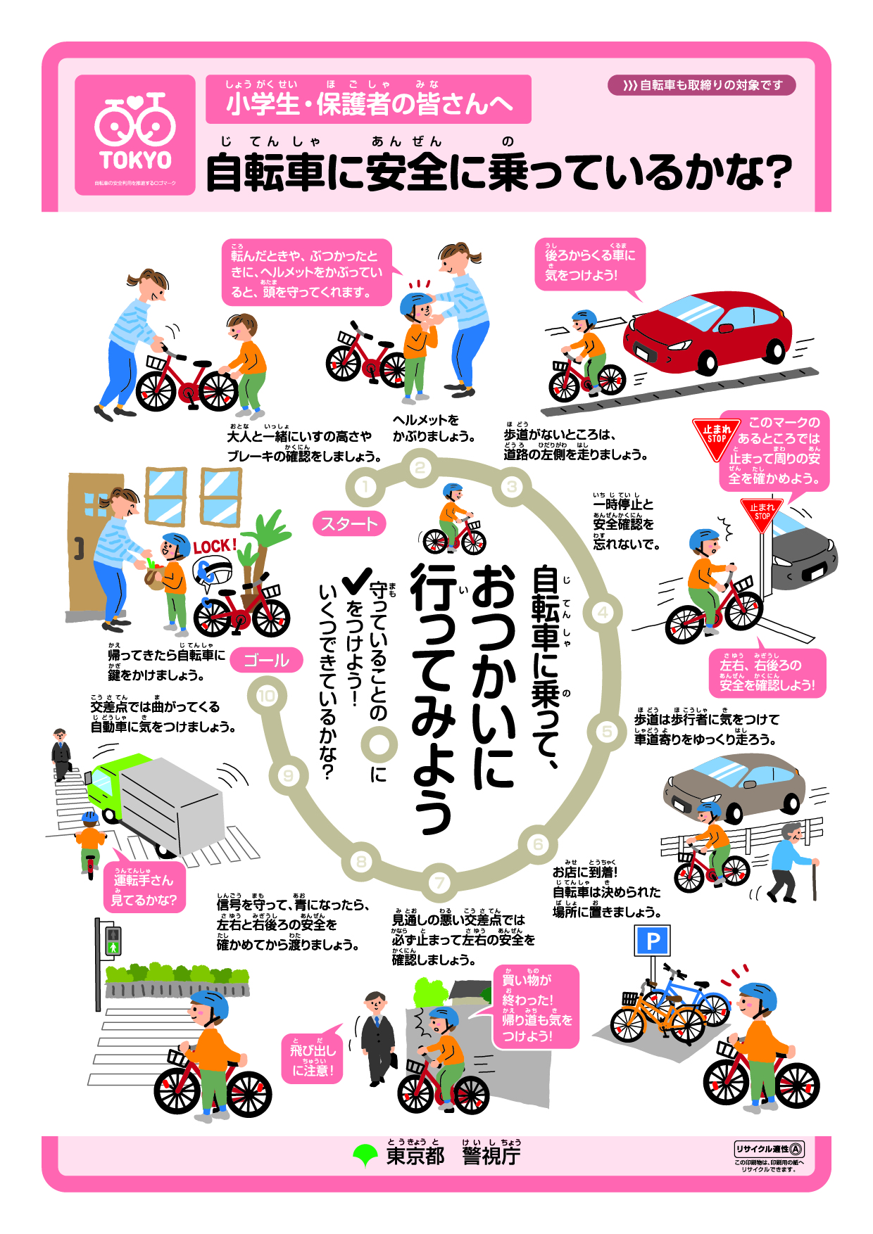 東京都は、都内の国公私立小学校・中学校・高等学校等の児童・生徒をはじめ、各種イベント等で、自転車の交通ルールをわかりやすく説明したリーフレットを配布しています。