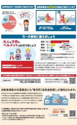 自転車販売時に交通ルール等を周知するため、au損害保険株式会社が「自転車ルール・マナー確認書」を作成し、一般社団法人東京都自転車商防犯協力会及び東京都の協力のもと、自転車販売店(東京都自転車商防犯協力会加盟店)に配布しました。令和8年度には自転車の交通違反に対する「交通反則通告制度」いわゆる青切符制度の適用が予定されていますので、今一度、自転車ルールの確認にご活用ください。